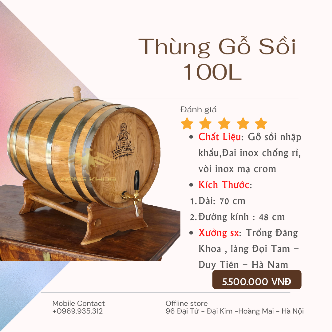 Thùng rượu gỗ sồi 100L được làm từ gỗ sồi nhập khẩu 100% ở Mỹ hoặc Nga, đây đều là gỗ sồi đỏ hoặc trắng. Với đường kính 48cm, chiều cao 65cm và có dáng đứng, sẽ phù hợp với nhiều khách hàng có ý định ủ rượu lâu dài. Bên cạnh đó, với kích thước này cũng có thể đặt tại các không gian nhỏ gọn. Hoặc, bạn cũng có thể lựa chọn mua sản phẩm này để mang biếu tặng các cơ quan đoàn thể hay tặng bạn bè... Đây chính là một món quà vô cùng độc đáo và ý nghĩa.