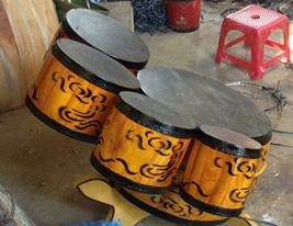 - Trống cái: Có chiều cao 30 cm, đường kính mặt trống 45cm. Trống được làm bằng gỗ mít mặt trống được làm từ da trâu, phát ra âm vực trầm, mạnh.